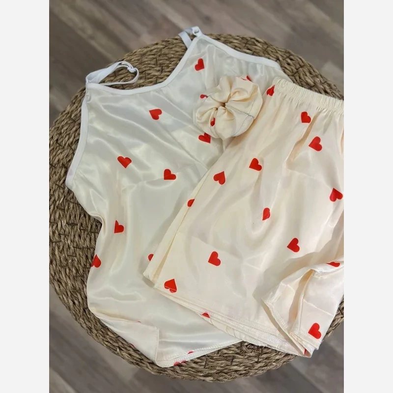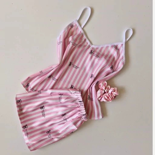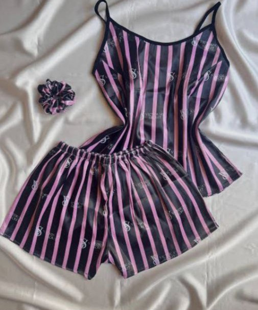 ست لباس خواب سه تیکه تاپ شلوارک و اسکرانچی راه راه صورتی و سفید با لوگو ویکتوریا سکرت تاپ و شلوارک فری سایز