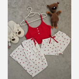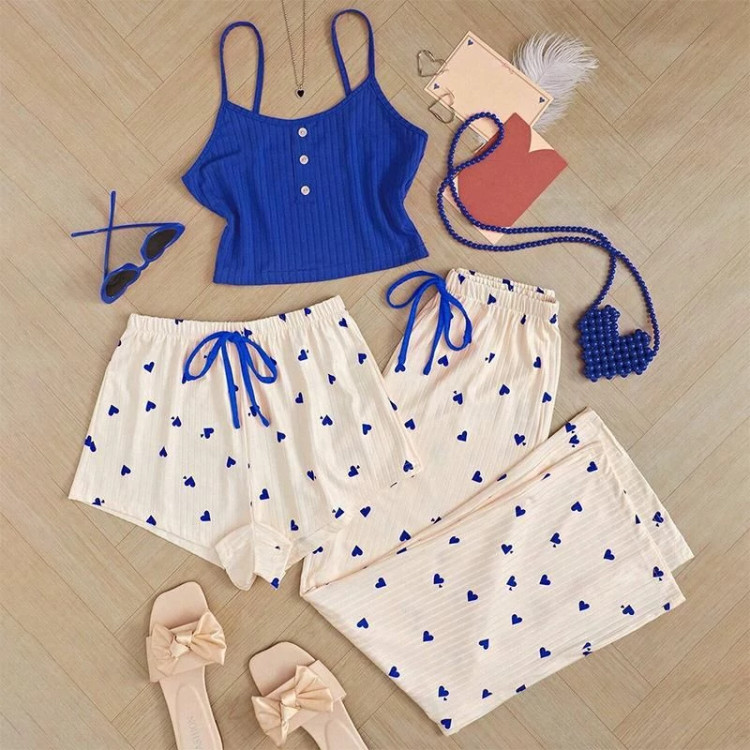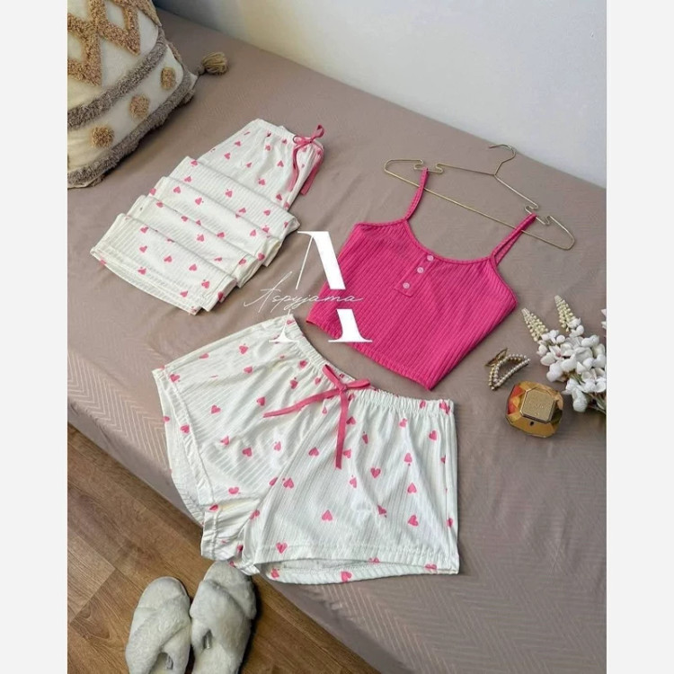 ست سه تیکه قلبی ❤️ جنس: کرپتی نرم و لطیف ✨ سایزبندی: M / L / XL 📏 مشخصات سایز: 🔹 مدیوم (M): • دور سینه: 70 (با کشسانی 100) • قد تاپ: 35 • دور ران: 60 (با کشسانی 70) • قد شورتک: 22 • قد شلوار: 100 🔹 لارج (L): • دور سینه: 72 (با کشسانی 102) • قد تاپ: 40 • دور ران: 64 (با کشسانی 80) • قد شورتک: 28 • قد شلوار: 100 🔹 ایکس لارج (XL): • دور سینه: 76 (با کشسانی 102) • قد تاپ: 42 • دور ران: 64 (با کشسانی 82) • قد شورتک: 29 • قد شلوار: 102